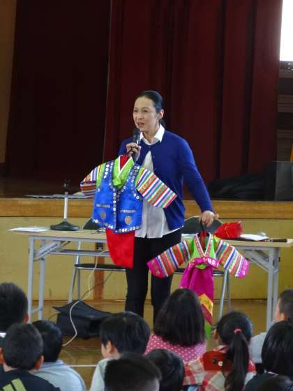今日,5・6年生が韓国・朝鮮の文化について学習しました。韓国語でのあいさつや自己紹介の仕方,学校給食で食べている韓国料理のクイズやカヤグムの演奏,韓国の遊びもあり楽しく学習しました。学習の後の子どもたちの感想には,「今日のお話を聞いて韓国に行ってみたいと思いました。」「カヤグムの演奏が素敵でした。」「韓国と日本はとても似ているなと思いました。」など,たくさんの感想がありました。いろいろな国の文化にふれる学習をこれからも続けて行きたいと思います。