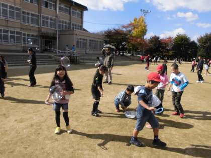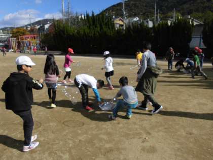 子どもたちは「地面にくっつくかなあ?」「大きいのを作ろう!」と,とても楽しんでしゃぼん玉を作りました。