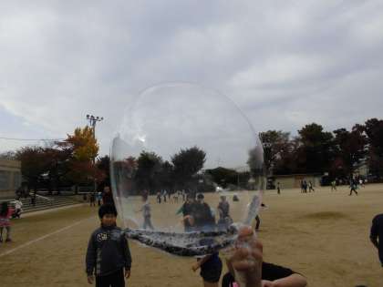 あおぞら学級のお友達がシャボン玉大会を計画してくれました。大きなシャボン玉がたくさんできて,子どもたちは大喜びでした。とっても楽しい休み時間になりました。