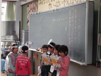 4月16日の授業参観日には,国語の学習をしました。グループごとに役割を決め,読み方を工夫して「ふきのとう」の音読発表会をしました。自分で絵を描いたお面を頭に付けて,やる気いっぱいの子どもたち。みんなの前でしっかりと読むことができました。これからも,気持ちを込めて声に出していくことを続けていきたいです。