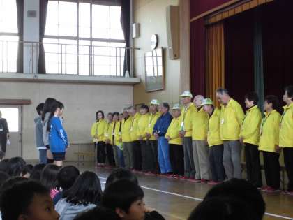 日野小学校の朝の集団登校や放課後の下校の時間に通学路の安全を見守ってくださっている地域の方に感謝をする会がありました。雨の日や風の強い日も,交差点や道の狭い危険なところなどでやさしく見守ってくださっています。今日の会では,感謝の気持ちとともに,これからもよろしくお願いしますという気持ちを伝えることができました。また,挨拶の大切さや命の大切さを感じることができる会になりました。