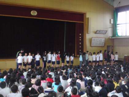 本日の朝会で児童会本部役員と各種委員会の委員長が自己紹介をしました。