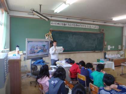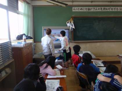 今日はタッチパネルを使って外国語学習の授業を進めました。