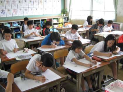 図工では,法界寺や萱尾神社を描いています。社会科の学習でも,地域にある歴史的な建物や遺跡を調べています。