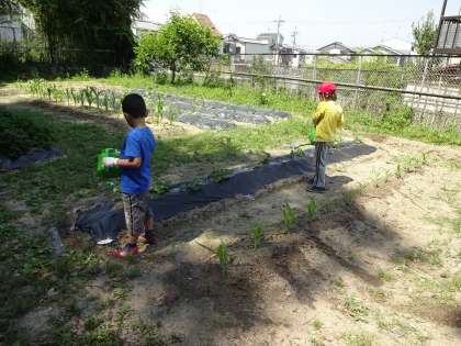 あおぞら学級の子どもたちは,畑の水やり・草ひきを頑張っています。