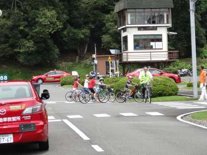 少年補導委員会による自転車安全教室が山科自動車教習所で11日(土)に行われました。子どもたちが走るコースには,実際の町と同じように自動車も走っていますし,信号機もあります。交差点や止まっている自動車の横を通る時,どんなことに気をつけて走ればいいのかわかりやすく教えていただきました。また,自転車の飛び出しが危険なことを実演していただきました。急ブレーキをかけて止まる自動車を見て自動車の怖さを改めて感じました。