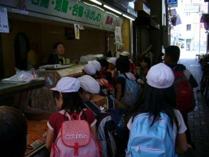 帰りは、古川商店街を通って東山駅から地下鉄に乗ります。この商店街も古い歴史をもつ商店街ですが、時勢に押されて・・・でも子ども達が「おっちゃん!こんにちは。」と声をかけると気軽に相手をしてくださいます。「今日は、お金持ってないんや。今度、お父ちゃんと来るわな。」というと「アハハ。」と笑ってられました。
