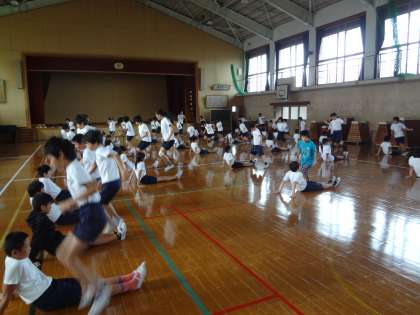 今日は朝ランニングが雨のためできませんでした。いつもなら,雨の日は,6年生が体育館でトレーニングをするのですが,今日は6年生が科学センターに行っていて,学校にいなかったので,5年生が体育館でトレーニングをしました。馬とびなどをして体をきたえました。