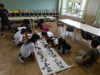 運動会にむけて,高学年は学年の競技,演技以外にも,係活動として準備もしています。運動会がスムーズに進むように,係活動でも力を合わせていきたいですね。児童会本部(司会進行・スローガン係)では,今年の運動会のスローガン「きずなを深め,仲間と協力し,笑顔で終われる運動会にしよう」を墨で書きました。