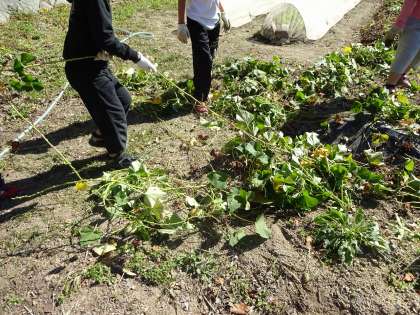 まず,長くてからんださつまいものツルに苦戦しながら,ツルを力いっぱい引っぱりました。