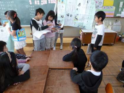 3年生になると,「総合的な学習の時間」という学習が始まります。今回は,その学習の中で作った新聞のことや,保育園と交流したぽかぽか交流のことについて発表してもらいました。子どもたちは興味を持って聞いていました。