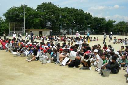 5/20(木)に縦割り班の初めての顔合わせを,この日がはじめての活動になります。6年生のリーダーの下に集まり,担当の場所へ移動しました。