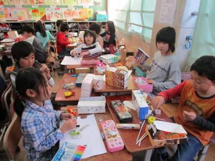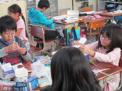 図画工作科の「ゴムの力で」の学習で,ゴムで動く仕組みのおもちゃを作っています。