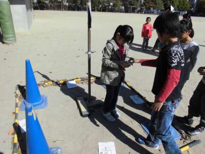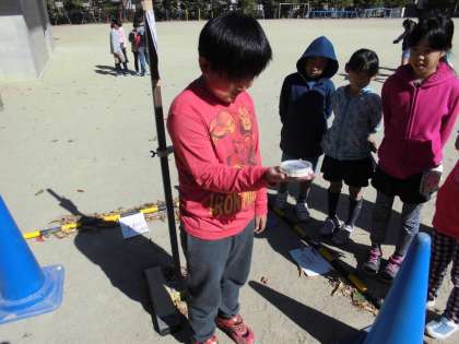 理科の「太陽の動きと地面のようす」についての学習で,午前と正午の太陽と影の位置を観察しました。