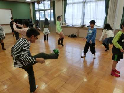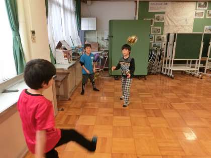 遊びを通して韓国の文化に触れました。今回はチェギチャギとペンイコマをしました。チェギチャギの遊び方は,日本の蹴鞠に似ていますが,チェギの形は丸ではなくバドミントンの羽のようなものです。ペンイコマは皮の紐がついた棒で,コマが止まらないように叩きながら回す遊びです。苦戦しながらも楽しく学習できました。