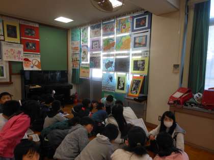 支部巡回展の鑑賞をしました。伏見東支部10校の子ども達の作品が多目的室に掲示されています。「この版画すごい!」「1年生やのにうまいなあ…」と子ども達は友達と話しながら,鑑賞メモをとっていました。