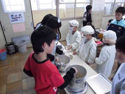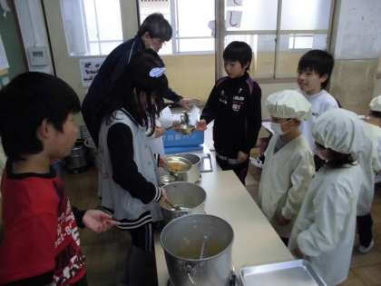 給食当番のとき、6年生がお手伝いに来てくれています。