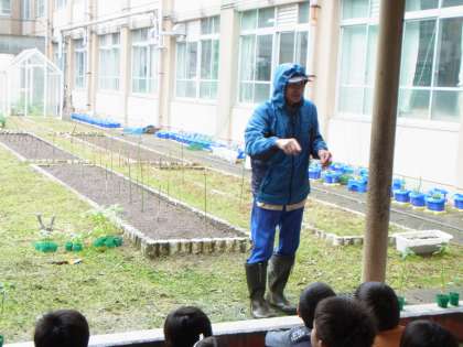 多目的でお話を聞いた後は,中庭の畑と運動場のすみにある畑に移動し,苗の植え方や育ち方についてお話を聞きました。