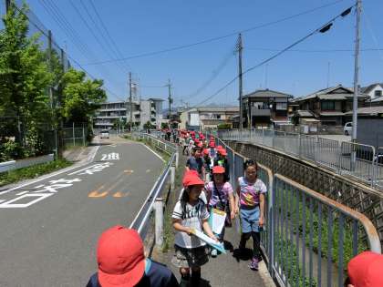 今日は社会科の学習で地域の様子を見るために,北コースと南コースに分かれて校区探検をしました。「ここは家ばっかり建っているなぁ。」や「田んぼがあるとこだ。」などとメモをしながら地域の様子を目で確認していました。