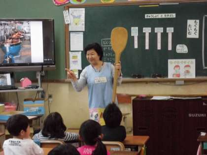 また、給食室の様子も教えていただき、650人以上の給食を作っているお鍋の中をかき混ぜる大きな木べらも見せていただきました。みんなよりも大きいし、少し給食のおいしいにおいのする木べらでした。