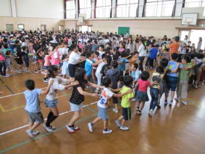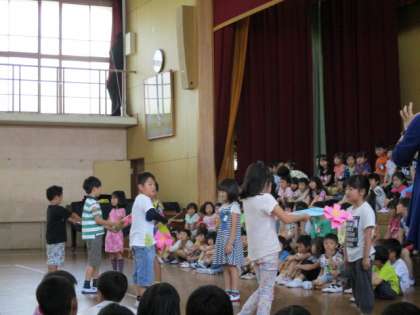 2年生からお迎えのプレゼント(アサガオの種)があり,その後,児童会本部が企画してくれた“猛獣狩りにいこうよ”と“貨物列車”を全員でして遊びました。