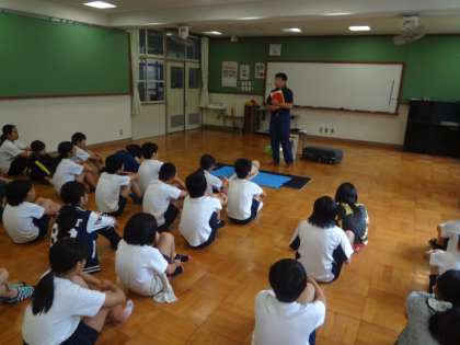 消防署の方に来ていただいて,救急救命についてのお話をしていただいたり,胸骨圧迫の方法について教えていただいたりしました。胸骨圧迫は意外と力がいるので,子どもたちも苦労しているようでした。