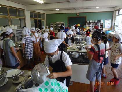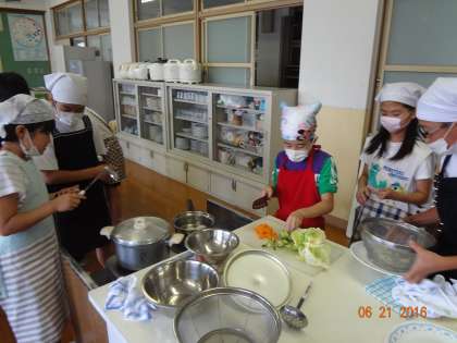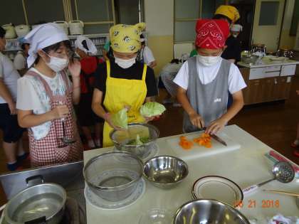 包丁ややけどに気を付け,野菜やたまごを茹でて盛り