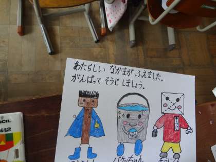 昨年度までのそうじくんとほうきくんに加えて新たなキャラクターを作っています。学校のみんなが頑張ってそうじができるように,新たなキャラクターがきっかけになるといいなと考えています。