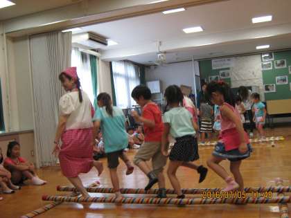 今日の多文化学習は、1年生がフィリピンについて学習しました。フィリピンの食べ物や動物などについて紹介してもらい、バナナでできた「バナナケチャップ」があることも知りました。また、「小さなクモの歌」という手遊びを教えてもらいました。この歌には「あきらめないでがんばること」というメッセージがあるそうです。子どもたちがいちばん楽しそうにしていたのは「バンブーダンス」です。終わりの時間になっても、「もっとやりたい」という声があちらこちらであがっていました。