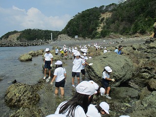 みさきの家に来て太平洋の大きな海原を見たのは今日が初めてです。太平洋を望む宮崎浜での磯観察ではヤドカリやカメノテ、フジツボなどたくさんの磯の生き物たちと触れ合うことができました。手のひらにいっぱいになるほどヤドカリを集める子どもや、一匹のヤドカリが動き出すのをじっと眺めている子どもなど、それぞれが自然との触れ合いを楽しみました。磯観察の後は、みときの家のプールで水泳学習を行いました。子どもたちも大喜びでした。