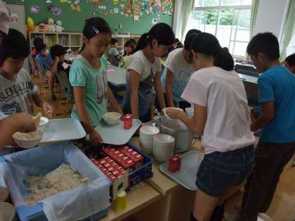 机上のバイキングをした後,ランチルームではその日の献立を使って,