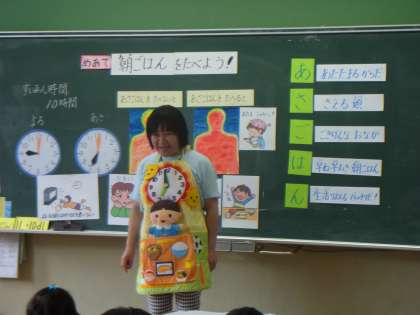 2時間目に中野先生に食の指導に来ていただきました。今日のめあては「朝ごはんをたべよう!」です。朝ごはんを食べることで1日を元気にすごすことができるということがわかりましたね。朝ごはんを食べるために,夜はしっかり寝て,朝早く起きることを心掛けましょう。