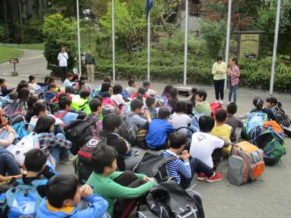 花脊山の家に到着し入所式を行いました。所員の方から,1.しっかり活動をして,しっかり食事をとり,しっかり寝ること,2.めあてに向かって頑張って活動すること,3.豊かな自然に触れ合うこと,の3つについてがんばろうというお話を聞きました。今日の日野小学校のめあては「自然」です。花脊の豊かな自然にいっぱい触れ合おうと思います。