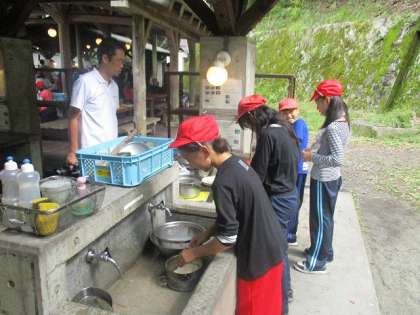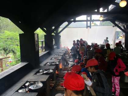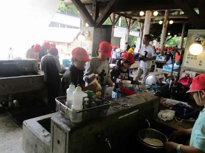 山の家の所員の方から野外炊事の注意を聞いた後、さっそく各係に分かれて調理開始です。火の係はもくもくとたちこめる煙の中で涙を流しながら、おかず係は玉ねぎを切り涙を流しながら、ご飯係は涙はありませんが、水の量を教えてもらった方法で慎重に確かめながら、みんなで協力をして昼食を作りました。飯盒のご飯がこげてしまったところもありましたが、すき焼き風煮の味はばっちり!とてもおいしかったです。山の家の楽しい思い出がまたひとつ増えました。野外炊事のあとは冒険の森でスリル満点のフィールドアスレチックを楽しみました。夕食の後はキャンプファイヤーを行います。