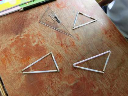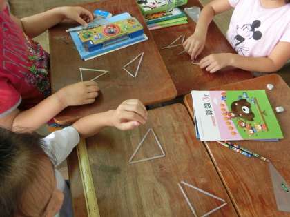 算数で三角形の学習に入りました。初めは色と長さが違う4種類のストローを使い,いろいろな三角形を作りました。全て同じ色のストローでできた三角形,同じ色を2本使った三角形,全て違う色のストローでできた三角形の3種類に分けることができました。次からは三角形の種類について詳しく調べていきたいと思います。