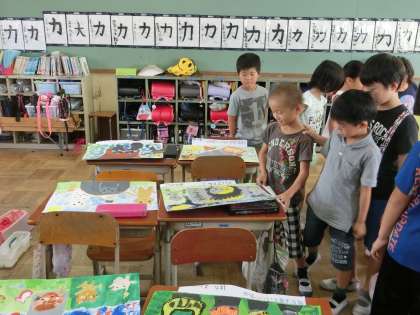 今日は完成したお話の絵を鑑賞しました。友だちの絵の塗り方や表情の描き方,背景の付け方など,いいところを見つけました。また,自分の絵の中で工夫したところや,次はもっとこうしたいという改善点なども挙げ,お話の絵の振り返りをしました。