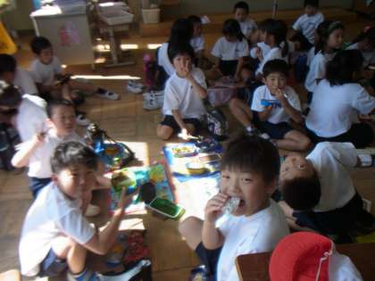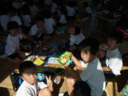 運動会のお弁当は,机を後ろにひいてみんなで食べました。おうちでつくってもらったお弁当はとってもおいしいですね。「たこさんウインナーが入っているよ。」「からあげが入ってた。」といろいろなところから声が聞こえてきました。