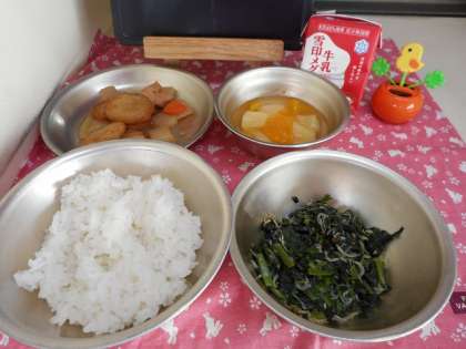今日の給食は,「ごはん・牛乳・平天とこんにゃくの煮つけ