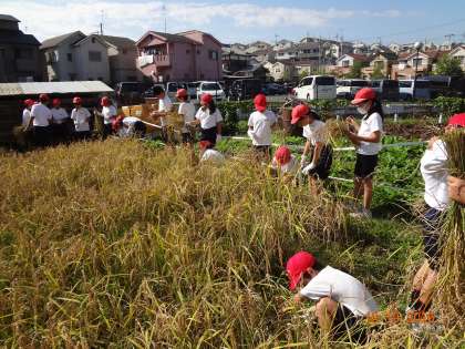 初めて稲刈りに挑戦する子も多く,やり始めたときは
