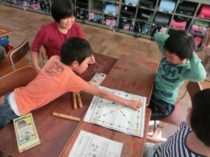 お隣にあって,名前もよく聞く国である韓国。韓国のイメージを聞いてみると,辛い食べ物がある,キムチ,日本とよく似ているものがある,隣にある国,など,の意見が出てきました。韓国の場所や国旗,民族衣装などの写真を見ながら少し韓国について知った後,ユンノリという遊びをしました。ユンノリはすごろくに似た遊びで,サイコロの代わりに木の棒を投げてコマを進めます。チーファージャー!という掛け声と共に,楽しそうに韓国の文化に触れていました。