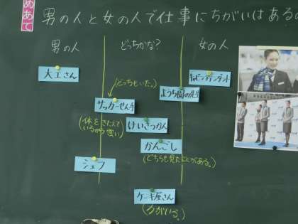 今日は事前にとっていたみんなの将来の夢のアンケートを基に,誰がする仕事なのかについて考えました。「大工さん」は男の人がしている,「キャビンアテンダント」は女の人がしている,などのようなイメージが頭の中にあったようです。しかし,サッカー選手や警察官,ケーキ屋さん,幼稚園の先生などは,男女どちらとものイメージがあったようです。また,子どもたちは,男性のキャビンアテンダントの写真や,女性のパイロットの写真を見てびっくりしていました。「男の人や女の人など関係なく,したい仕事をしてみたい。」「今まで男の人の仕事だと思っていたけど,女の人もその仕事をしていてびっくりした。」など,感じたことを振り返っていました。