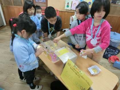 今日は2回目のぽかぽか交流がありました。保育園に行き,今まで準備してきたお祭りのお店を開いて,楽しんでもらいました。コイン落としや輪投げ,すごろく,ボーリングなど,8種類のお店を開きました。保育園児との交流を楽しみに準備を進めてきたので,充実した時間になりました。次回は小学校に来てもらい,学校を案内できたらと思っています。