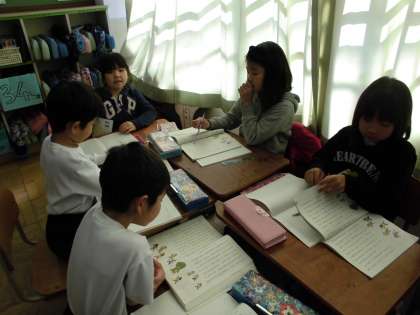 国語科では,おにごっこの遊び方とその面白さを見つけながら読んでいます。グループで教科書を読みながら,学習を進めています。今日は自分のすきなおにごっこの遊びとそのおもしろさをノートに書きました。