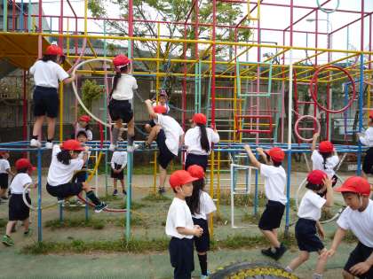 子どもたちに大人気の総合遊具。はしごを上手に登ったり,頭がぶつからないように気を付けて遊んでいました。1年生の間は,2階までですがみんなと一緒に楽しく遊んでいました。