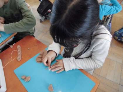 図工科では,粘土を使って「切ってかき出しくっつけて」をしています。たこ糸を使うと粘土がきれいに切れることがわかりました。その他にも,割り箸をつかい,かき出したものをくっつけて作品を作りました。