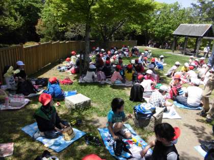 たくさん遊んでおなかもペコペコの子どもたち。楽しみにしていたお弁当の時間です。仲良くなったグループのみんなと一緒に楽しくランチタイムをしました。芝生の上で食べるお弁当はとってもおいしかったです。