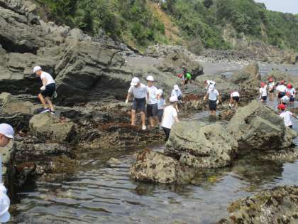 磯観察ではたくさんの磯の生き物と触れ合うことができました。ひとでやたこ、あめふらしややどかりなど……中には、ウツボを見たという子どももいましたが??……みさきの楽しい思い出がまた一つ増えました。