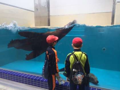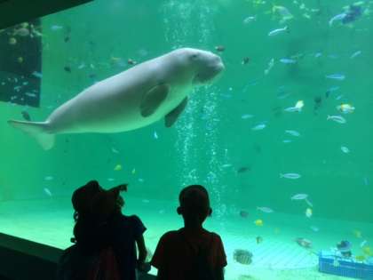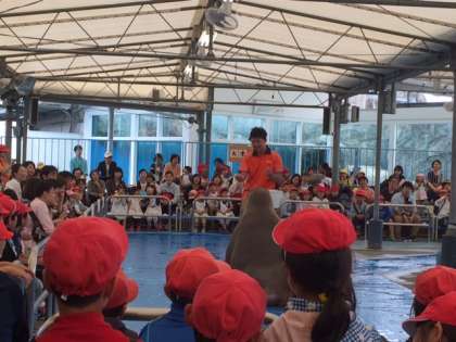 ショーを見たり,ジュゴンや見たことのない魚たちを見たり…。今,館内をグループで見学中です。