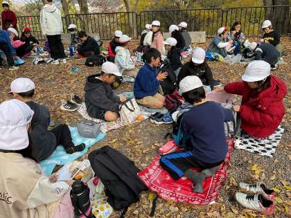 待ちに待ったお弁当の時間。班の友だちと一緒に「いただきます!」お弁当を見せ合いながら、おいしそうに食べていました。