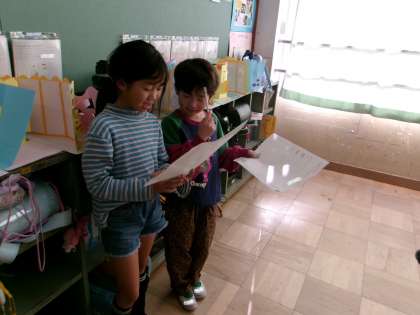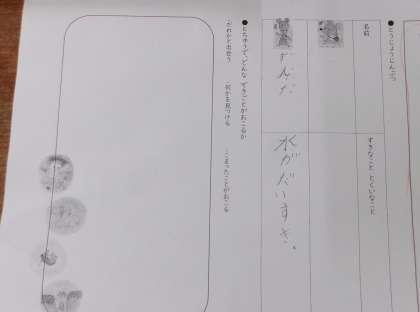 国語の学習の様子です。どんな登場人物が出てくるか考えた後、どんな出来事が起こるかを考えました。友だちと交流する中で、どんどん想像が膨らんで、夢中になって書いていました。